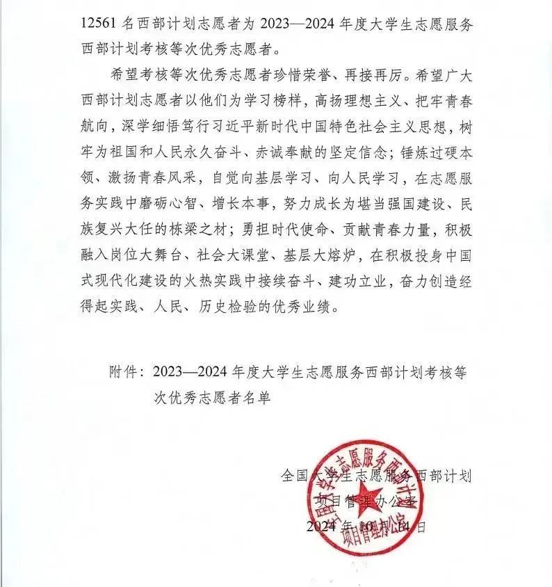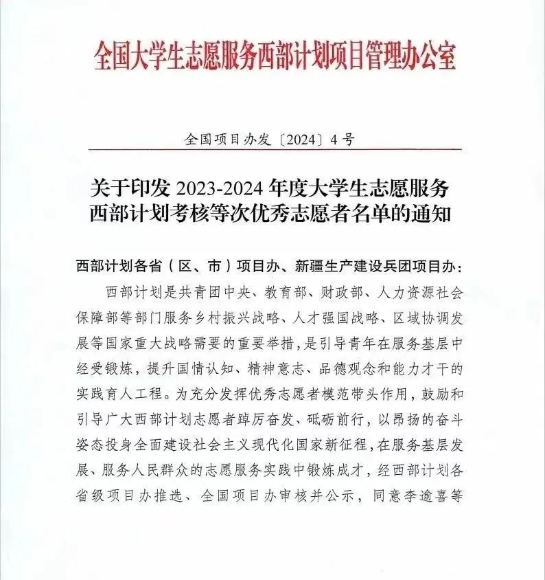 在全国老员工志愿服务西部计划项目管理办公室印发的《关于印发2023-2024年度老员工志愿服务西部计划考核等次优秀志愿者名单的通知》中,公司电子193班毕业生杨朝江获评全国2023-2024年度老员工志愿服务西部计划优秀志愿者。