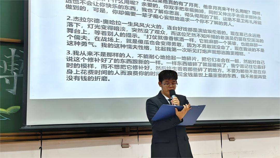 赛事设置“感我之言”与“读我所爱”两大环节。在“感我之言”环节,参赛选手借助PPT将经典著作的脉络精髓与个人体悟巧妙融合,展现出扎实的文学积淀与思维深度。在“读我所爱”环节,选手们选取书中动人片段,通过深情朗诵与情境演绎再现经典场景,引领观众步入一场跨越时空的心灵对话。